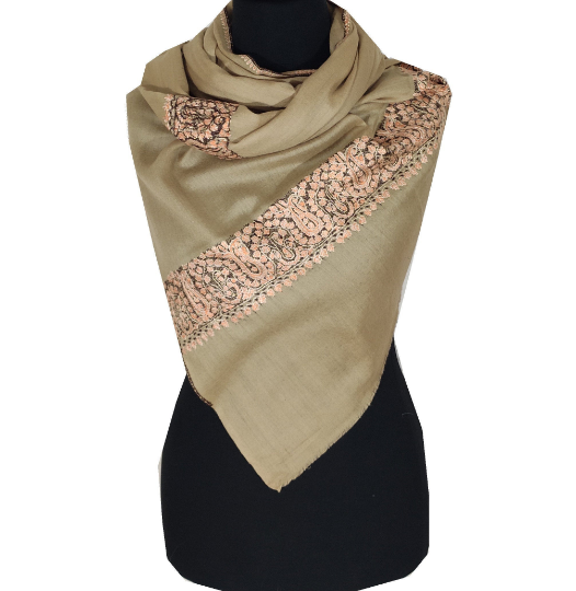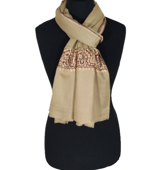 Set aside your own statement of style and gear up in this lovely and stunning cashmere scarf with beautiful sozni pattern adding colour to its calm surface. It discovers its beauty in its very concept colour scheme more especially in the brilliantly sozni embroidery patterns that embellish the entire field. The background colour and the colours of the design motifs have been amicably matched. The scarf is rare in ethnicity and indigenous flavour.