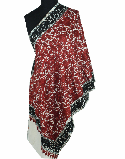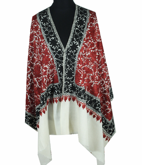For the fervent lovers of white, here is an ivory white base in cashmere wool playing abode to vibrant flora crafted precisely in the charisma of the classical crochet hook cashmere chain stitch embroidery work, adding color and passion to any outfit it is matching with. It is this proficient embroidery which adorned the plush wrap decorate it from top to bottom in an astounding series of flowers, maple leaves and paisleys which lie ingrained within each other.
