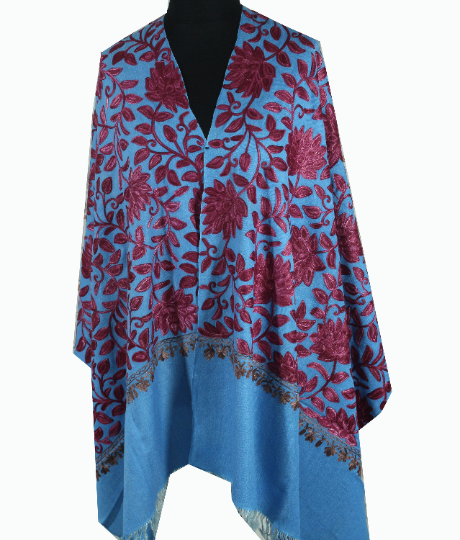 Let the luxury and comfort of this blue cashmere shawl envelope you in a warm embrace. The wrap is a myriad of floral embroidery which spans its length and breadth. It discovers its beauty in its very concept colour scheme more especially in the brilliantly floral-patterns that embellishes the entire field. The background colour and the colours of the design motifs have been amicably matched. The scarf is rare in ethnicity and indigenous flavour. This beautiful scarf is incredibly versatile and can be worn in a number of ways draped gently over both or one shoulder or worn loose for a more relaxed daytime effect. Its soft touch and dazzling looks make it an essential pick, waiting to get a place in your fashionable wardrobe.