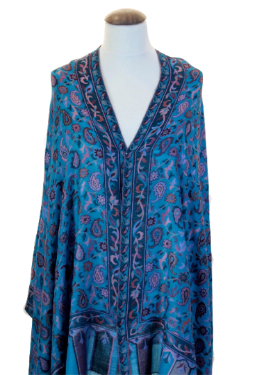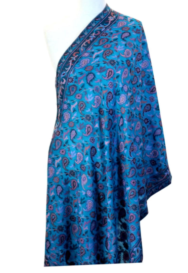 Turquoise Blue Handmade Cashmere Pashmina Kani Jamawar Scarf / wraps with Woven Paisleys.