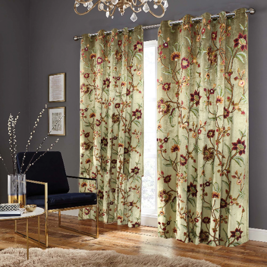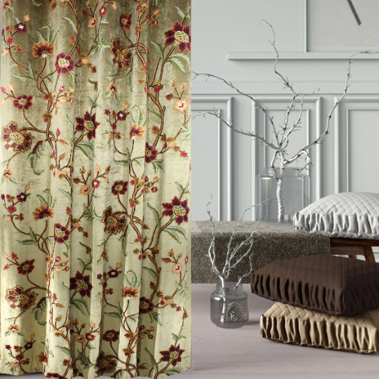 You can design your drapes using our Crewel Fabrics, fully lined, or unlined with free stitching. We offer many different heading types and make curtains/ drapes as per your measurement and style.
