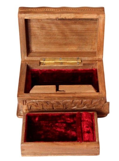 Adorn your living space with our beautifully designed Kashmir Carved Handmade Walnut Wood Jewelry Box. Because the jewellery you wear is precious, the very thing in which you safeguard it in should be no less! Handpicked hence is a jewellery box, crafted by a skilled craftsman who chisels out a base of Kashmiri walnut wood with utmost skill and dedication to engrave Marigold flowers throughout its essence. The box begins its journey as a plain wooden plank which is moulded and given the form of a box. This box is then given to the artisan who breathes a new life into its blandness. Perfect to hold your treasures, the classic piece of storage contains two layered compartments, one opening upto the other. The velvet lined jewellery box is opened by pushing the lower panel from left to right and pulling which adds to its impeccability add this splendid storage to your dressing table and let your jewels rest in something as precious as they are.
