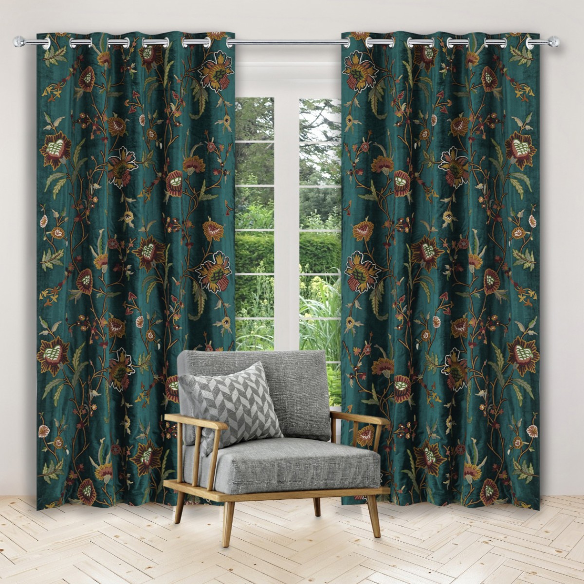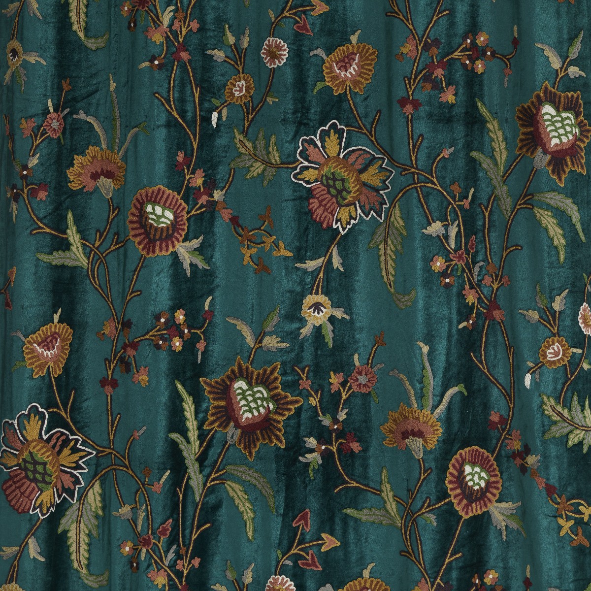 Elegant Teal Green Velvet Hand-Embroidery FULLY-LINED Crewel Curtain
